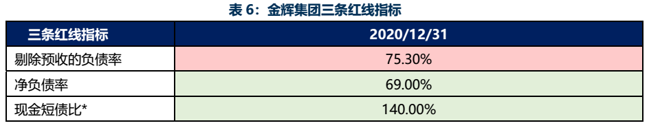 雖曾頻繁高溢價拿地,但相比于其他閩系的激進擴張,金輝集團的布局節(jié)奏顯然緩和許多,致使財務(wù)壓力較輕。截至2020年末,公司三條紅線僅踩1條,為黃檔。