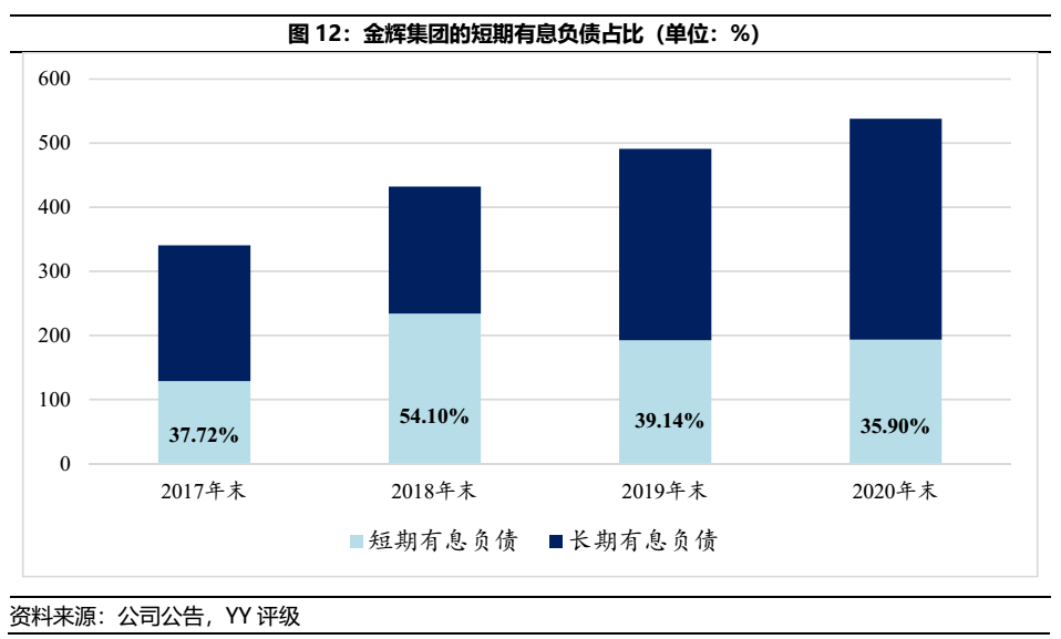 然而,如大多數(shù)民營房企,盡管金輝集團的表內(nèi)資金鏈壓力尚可,但缺乏國資背景的股東劣勢致使短債常年居高不下。近4年的短債占有息負債比例均高于35%,未來或仍難以有效利用長債置換短債。