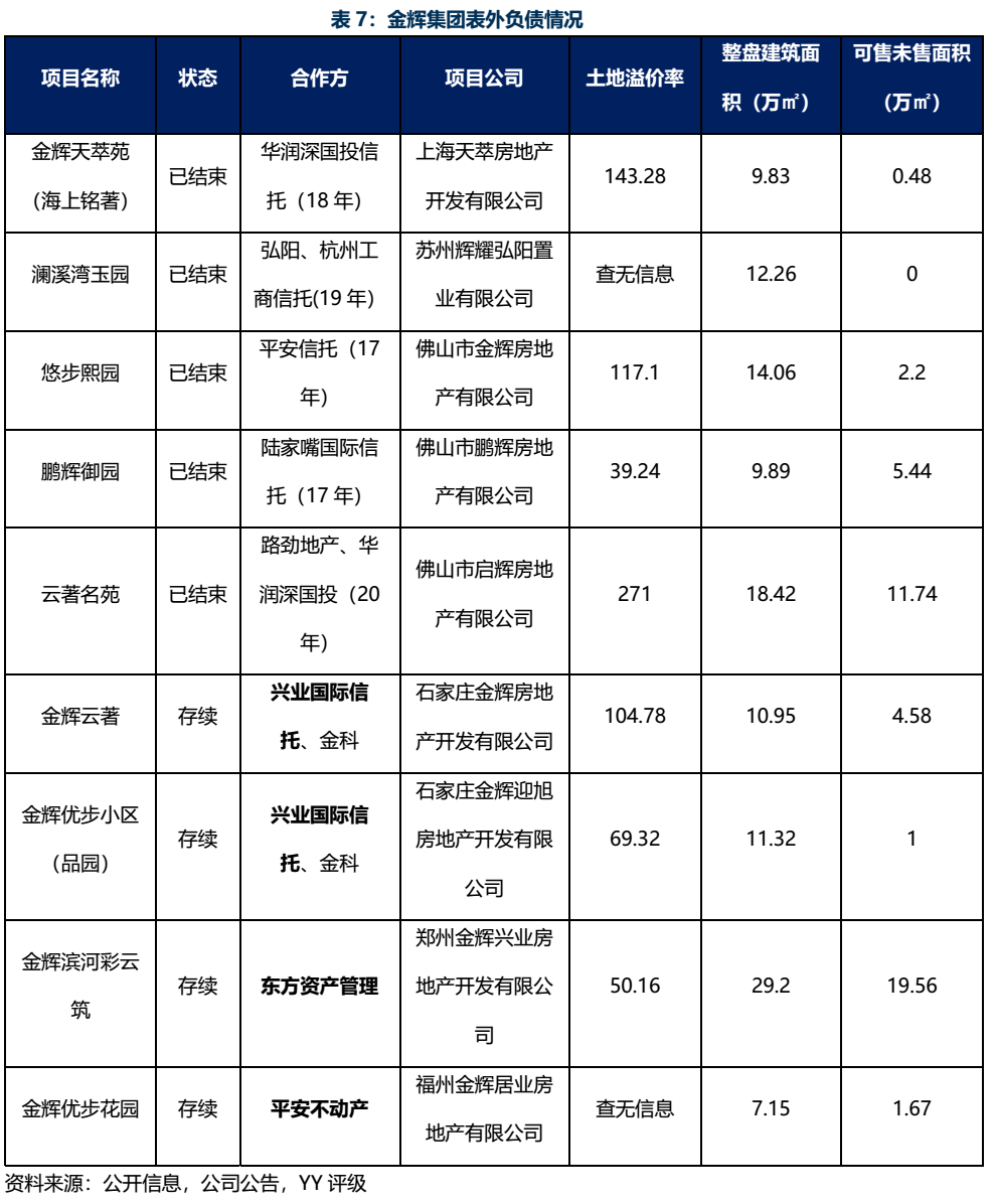 根據(jù)項目公司與樓盤名比對參考,羅列如表7的表外負債可見,金輝集團的存續(xù)表外負債情況較少,多為已結(jié)束的前融資金。然而,也可見個別的土地溢價率發(fā)現(xiàn),非標資金多參與了高單價地塊的投資,因此后續(xù)仍需關(guān)注金輝集團選擇的投資運營模式,跟蹤其招拍掛溢價情形,關(guān)注隨著高溢價拿地而來的表外負債。