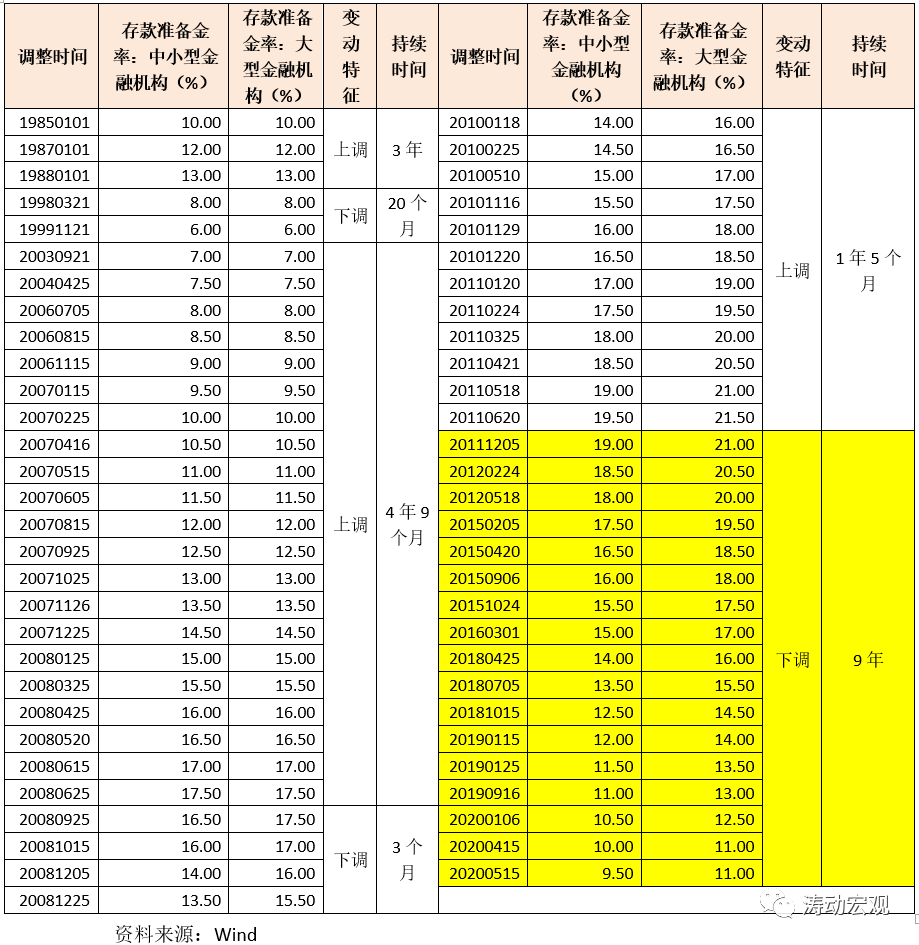 自1985年我國實行法定存款準備金制度以來,我國存準率共調整58次,其中2007年以前調整10次、2007年以來調整48次。自2011年起,我國便已進入降準的長周期中,而央行也通過這種縮表式的降準來達到兩個目的,一是滿足政策層面和經濟基本面的訴求,二是來滿足銀行貸款創造存款后繳納法定存款準備金的需求。