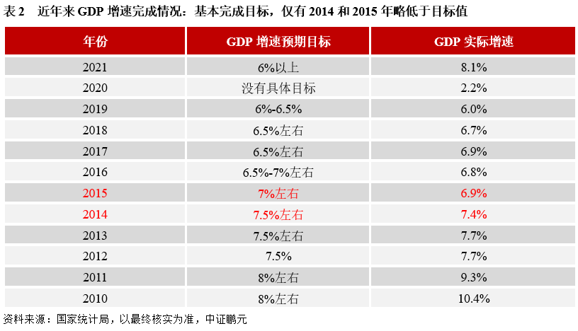 從歷史來看,絕大多數年份基本完成或超額完成了GDP增速目標,只有2015和2014年實際增速略低于目標值。2015年和2014年的GDP預期目標為7%和7.5%左右,實際完成值為6.9%和7.4%,均低于目標值0.1個百分點。