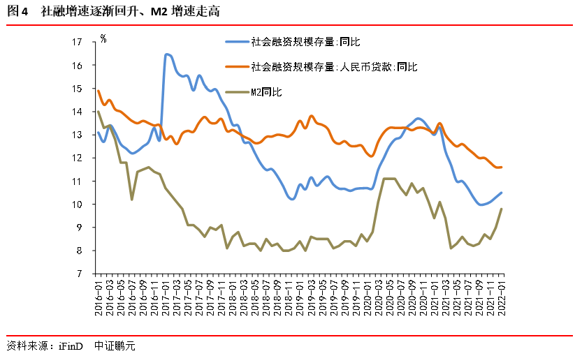 重在寬信用,特別提出擴大信貸規模。2021 年全年金融機構新增人民幣貸款 19.95 萬億元。2022年1月社融增速為10.5%,前值為10.3%;M2同比增速為9.8%,前值為9.0%。2021年1月,央行貨幣政策司司長孫國峰發表《健全現代貨幣政策框架》一文指出:“ 基本匹配不意味著完全相等,M2和社會融資規模增速可以根據經濟形勢和宏觀經濟治理需要略高或略低于名義經濟增速,體現逆周期調節”。央行四季度貨幣政策執行報告指出“2021 年末,M2 和社會融資規模同比增速分別為 9%和 10.3%,同名義經濟增速基本匹配。從兩年平均看,2020 年、2021 年 M2 和社會融資規模增速分別為 9.5%和 11.8%,同兩年平均名義經濟增速基本匹配并略高”。今年社融增速預計在11.0%左右,比較符合預期,可能略高于名義經濟增速。