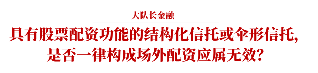根據2019年11月發布的《全國法院民商事審判工作座談會紀要》(以下簡稱《九民紀要》)第86條的規定,場外配資合同無效。最高人民法院民事審判第二庭在其編著的《全國法院民商事審判工作會議紀要理解與適用》一書中認為:“單一資金信托業務屬于信托公司正規的證券投資信托方式,也稱陽光私募,其投資收益和風險不分層,依法成立的單一資金信托合同應屬有效。對于在本輪股市劇烈波動中引發巨大爭議的結構化信托和傘形信托合同效力問題,我們認為,對于具有股票配資功能的結構化信托和傘形信托,應當認定為場外配資合同,在信托公司未取得融資融券國家特許經營許可的情況下,應當認定合同無效。”[1]