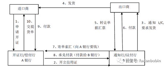 銀行有條件的付款承諾,即開證銀行依照客戶(開戶申請人)的要求和指示,承諾在符合信用證條款的情況下,憑規定的單據向第三方(受益人)或其制定人進行付款或承兌,授權另一家銀行進行該項付款或承兌,或授權另一家銀行議付。具體業務流程如圖(前提是簽訂合同,并約定信用證付款)。