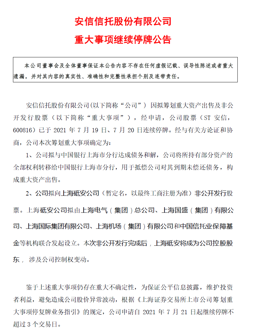 在討論今天這份公告之前,有必要再回憶一下7月16日也就是上周五安的重大事項(xiàng)停牌公告。那份公告中的關(guān)鍵詞為擬籌劃重大資產(chǎn)出售及非公開(kāi)發(fā)行股票,并且用加粗的字體標(biāo)明上述重大事項(xiàng)可能涉及公司控制權(quán)的變動(dòng);申請(qǐng)自2021年7月19日起繼續(xù)停牌不超過(guò)兩個(gè)交易日。而今天下午的這份公告,已經(jīng)將上述事情交代的明明白白:1.擬出售重大資產(chǎn)是將部分資產(chǎn)的全部權(quán)利轉(zhuǎn)移給中國(guó)銀行上海市分行,用于抵償?shù)狡谖磧斶€的債務(wù),構(gòu)成了重大資產(chǎn)出售;2.另一個(gè)非公開(kāi)發(fā)行股票以及涉及公司控制權(quán)變動(dòng),指的是安信向新設(shè)立的上海砥安公司(下稱(chēng)“砥安公司”)非公開(kāi)方式發(fā)行股票,而這家公司由電氣,國(guó)盛,國(guó)際,機(jī)場(chǎng)四大國(guó)資集團(tuán)以及中國(guó)信托業(yè)保障基金等機(jī)構(gòu)聯(lián)合發(fā)起設(shè)立。