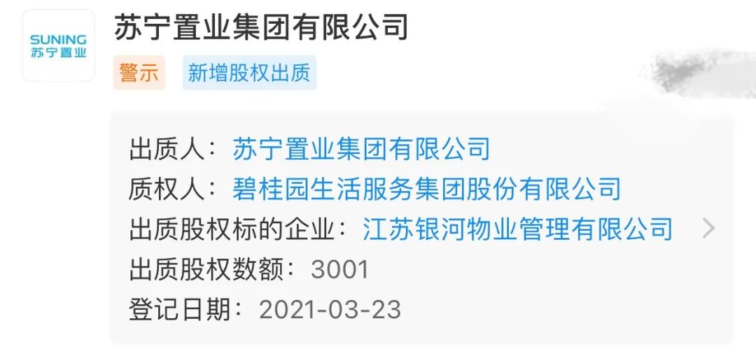 最新資料顯示,蘇寧置業(yè)將其所持江蘇銀行物業(yè)管理有限公司的全部股份,質押給了碧桂園生活服務集團,后者是碧桂園服務(06098.HK)在內地的主要運營平臺公司。