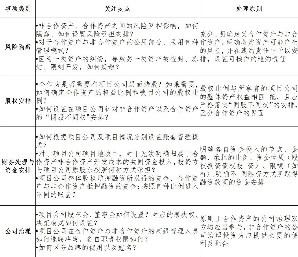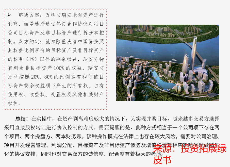 2)非目標資產的所有者權益部分不僅僅要在拆分時點大于0,更要考慮在標的資產完成開發,收購方退出時,非標的資產權益部分仍然要大于0,否則就會出現標的資產部分替非標的資產背債的情況,如果合作方有其他足值資產替非標的資產權益做擔保,也可接受。