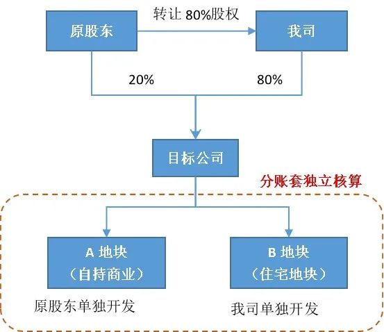 本次我們只講投拓實操中最常見到模式③,即是我方通過收購對方部分股權,但雙方約定該部分股權對應目標地塊100%的開發收益權,開發過程中,采用分帳套的方式獨立核算、分別管理。而非目標地塊則仍由項目公司原股東繼續開發。