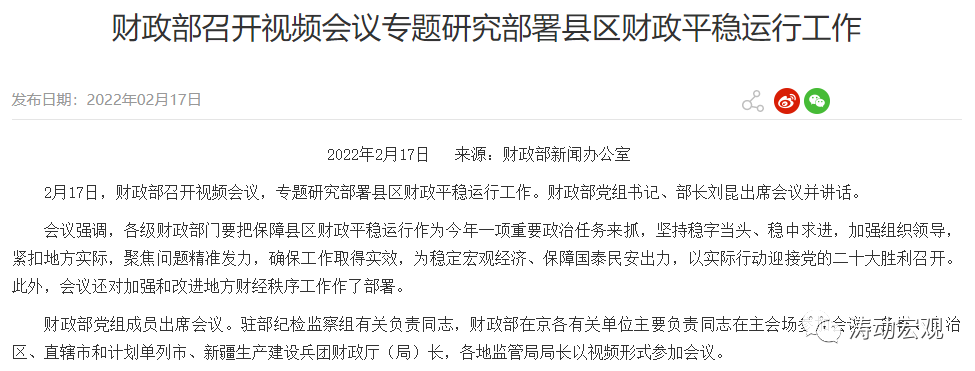 (一)2022年2月17日,財政部召開視頻會議,專題研究部署區(qū)縣財政平穩(wěn)運行工作,這應(yīng)是一個非常值得關(guān)注的信號,表明當前高層已經(jīng)開始關(guān)注區(qū)縣財政的平穩(wěn)運行問題,這其后的背景可能與近期徐州豐縣問題有關(guān),即當前徐州豐縣地區(qū)的融資已經(jīng)受到一定程度的沖擊。同時也表明,當前部分區(qū)縣財政可能遇到了一定現(xiàn)實的困難和問題,需要特別呵護、小心應(yīng)對。