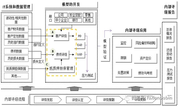 信用風險計量是現(xiàn)代信用風險管理的基礎和關鍵環(huán)節(jié),信用風險計量經歷了專家判斷法(即長期在一線業(yè)務骨干在承擔信用風險過程中逐步發(fā)展并完善起來的傳統(tǒng)信用分析方法,主要考察與債務人相關的聲譽、杠桿和收益波動性等指標,及與市場相關的經濟周期、宏觀經濟政策、利率水平等指標)、信用評分模型到違約概率模型三個主要發(fā)展階段。現(xiàn)在對于信用風險的計量主要依賴于對借款人和交易風險的評估,主要是從客戶評級維度和債項評級維度兩個方向展開。