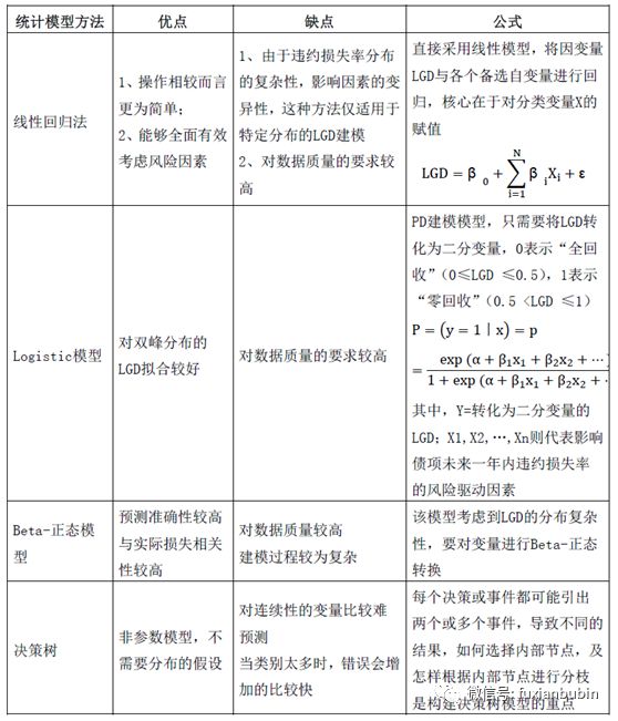 最后則是設計、建立統(tǒng)計模型,并給予實際業(yè)務經驗對模型及其估值參數(shù)進行調整,進而彌補不完善的數(shù)據(jù),使模型的參數(shù)更加符合實際業(yè)務經驗。最終通過LGD值與債項等級的映射,構建債項評級體系。根據(jù)金融機構的業(yè)務特色,金融機構可結合各自的資源稟賦和各個統(tǒng)計模型的優(yōu)缺點,從中篩選適合自身的統(tǒng)計模型(統(tǒng)計模型方法如下表):