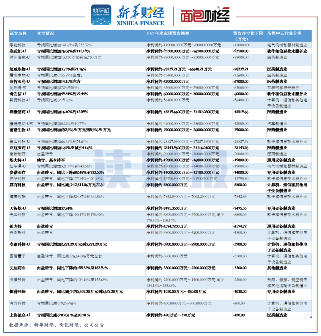 經統計,共有32家科創板上市公司預計2021年的歸母凈利潤為負。其中,以預告凈虧損的下限統計,孚能科技和寒武紀-U分別預計發生凈虧損11億元和9.35億元,為當期的“預虧王”,且兩家公司的凈虧損均較上年有所增加。
