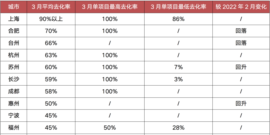 項目去化高于平均值的城市有14個,但開盤去化率超六成的城市只有5個。此外,3月開盤去化率較2月回落的城市共有8個,只有5個城市開盤去化率有所回升。