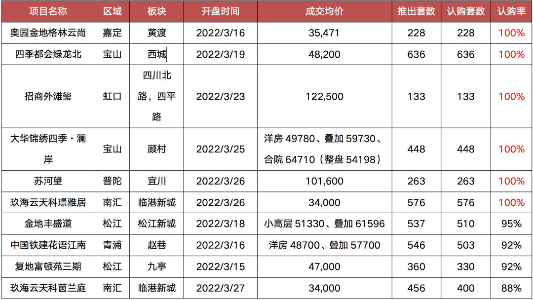 表:上海2022年3月部分開盤項目認購情況(單位:元/平方米,套)