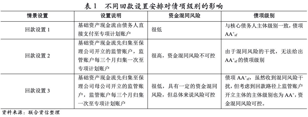 結(jié)構(gòu)化產(chǎn)品另外一個交易結(jié)構(gòu)的關(guān)注點(diǎn)就是基礎(chǔ)資產(chǎn)現(xiàn)金流的回款路徑和劃款頻率。眾所周知,國內(nèi)資產(chǎn)證券化產(chǎn)品由于在法律等方面很難做到完全的破產(chǎn)隔離,基礎(chǔ)資產(chǎn)現(xiàn)金流和資產(chǎn)服務(wù)機(jī)構(gòu)的其他現(xiàn)金流容易出現(xiàn)資產(chǎn)混同。現(xiàn)有緩釋這類風(fēng)險的主要方式就是控制回款路徑和劃款頻率。也就是說,回款現(xiàn)金流從產(chǎn)生至歸集到專項計劃賬戶的路徑和頻率是結(jié)構(gòu)化產(chǎn)品需要重點(diǎn)把控的環(huán)節(jié)。單一債務(wù)人供應(yīng)鏈產(chǎn)品也是如此。目前市場上存續(xù)的單一債務(wù)人供應(yīng)鏈產(chǎn)品基本上都能實(shí)現(xiàn)回款現(xiàn)金流閉環(huán),即基礎(chǔ)資產(chǎn)現(xiàn)金流一旦產(chǎn)生,直接回流至專項計劃賬戶,這種情況下資金混同風(fēng)險很低。但是評級根據(jù)多年的實(shí)踐,在大量的產(chǎn)品結(jié)構(gòu)設(shè)計中,發(fā)現(xiàn)產(chǎn)品回款設(shè)置存在多樣性,不同的回款設(shè)置帶來高低不一的混同風(fēng)險。所以即使底層基礎(chǔ)資產(chǎn)償付主體的償付能力和償付安排都相同,但也會可能由于基礎(chǔ)資產(chǎn)回款結(jié)構(gòu)設(shè)置的不同而導(dǎo)致最終產(chǎn)品面臨不同的償付風(fēng)險,最終影響債項的級別。