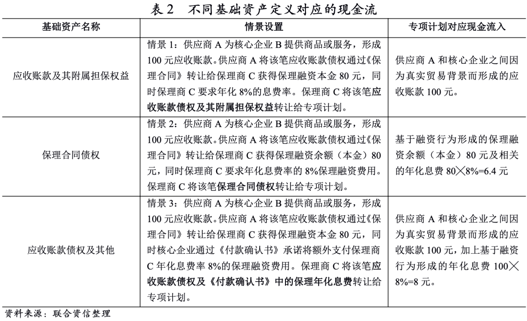 從基礎(chǔ)資產(chǎn)的角度看,資產(chǎn)支持證券的另外一端即為提供支持的“資產(chǎn)”,如何圈定基礎(chǔ)資產(chǎn)非常關(guān)鍵,基礎(chǔ)資產(chǎn)的定義不僅明確了專項計劃鎖定資產(chǎn)的法律關(guān)系,更確定了未來該類資產(chǎn)帶入的現(xiàn)金流,從而對于債項規(guī)模產(chǎn)生影響,此外基礎(chǔ)資產(chǎn)定義不同常常是受客觀條件所限而呈現(xiàn)不同的選擇,基于風(fēng)險把控的角度應(yīng)仔細(xì)分辨其成因,不同的基礎(chǔ)資產(chǎn)在交易安排上也需匹配相應(yīng)確權(quán)文件以有效保障現(xiàn)金流信用質(zhì)量。目前單一債務(wù)人證券化產(chǎn)品常見的基礎(chǔ)資產(chǎn)定義為“應(yīng)收賬款及其附屬擔(dān)保權(quán)益”,但是也會有少量的“保理合同債權(quán)”“應(yīng)收賬款債權(quán)及其他”等非常規(guī)的定義存在,下面用表格的形式給出情景假設(shè)。