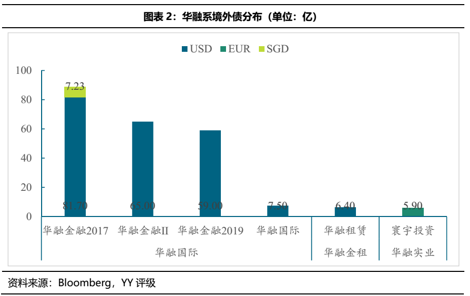 其中中國華融的二級子公司和三級子公司(除華融晉商)主要是作為SPV在境外發(fā)債,其境外債的最終債務(wù)人為中國華融的一級子公司。截至21年4月7日,華融系存續(xù)境外債合計219.60億美元、5.9億歐元及7.23億新加坡元,主要分布在華融國際、華融金租和華融實業(yè)三個一級子公司,其中華融國際目前的存續(xù)債規(guī)模最大。
