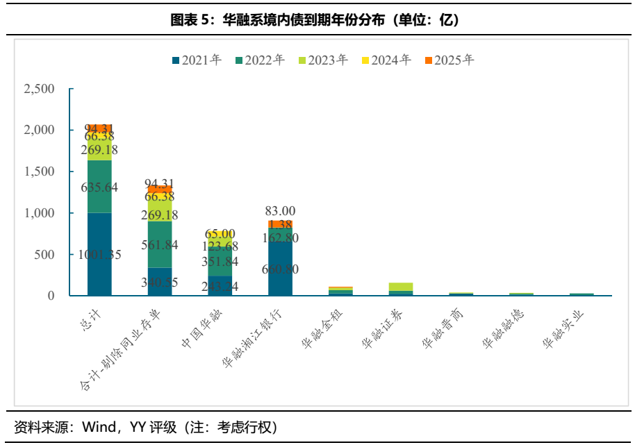 境內(nèi)債來看,華融系存續(xù)境內(nèi)債也集中在2021-2022年到期,2021年到期規(guī)模龐大,主因華融湘江銀行有660.80億的同業(yè)存單于2021年到期。在不考慮同業(yè)存單的情況下, 華融系2021-2023年分別有340.55億、561.84億和269.18億存續(xù)債到期,債務(wù)壓力很重。