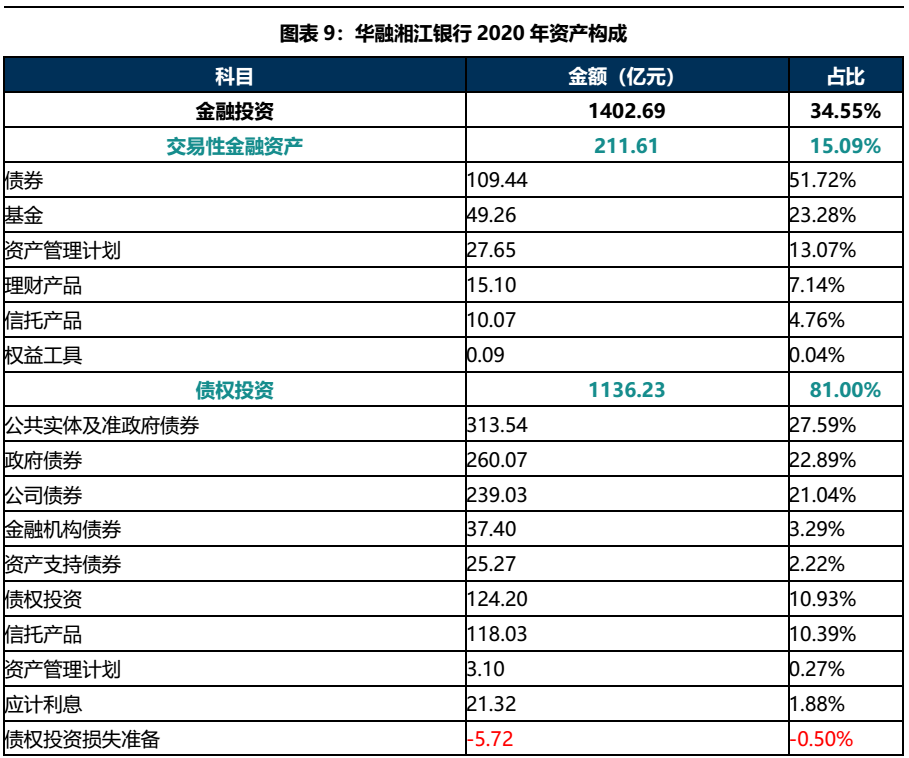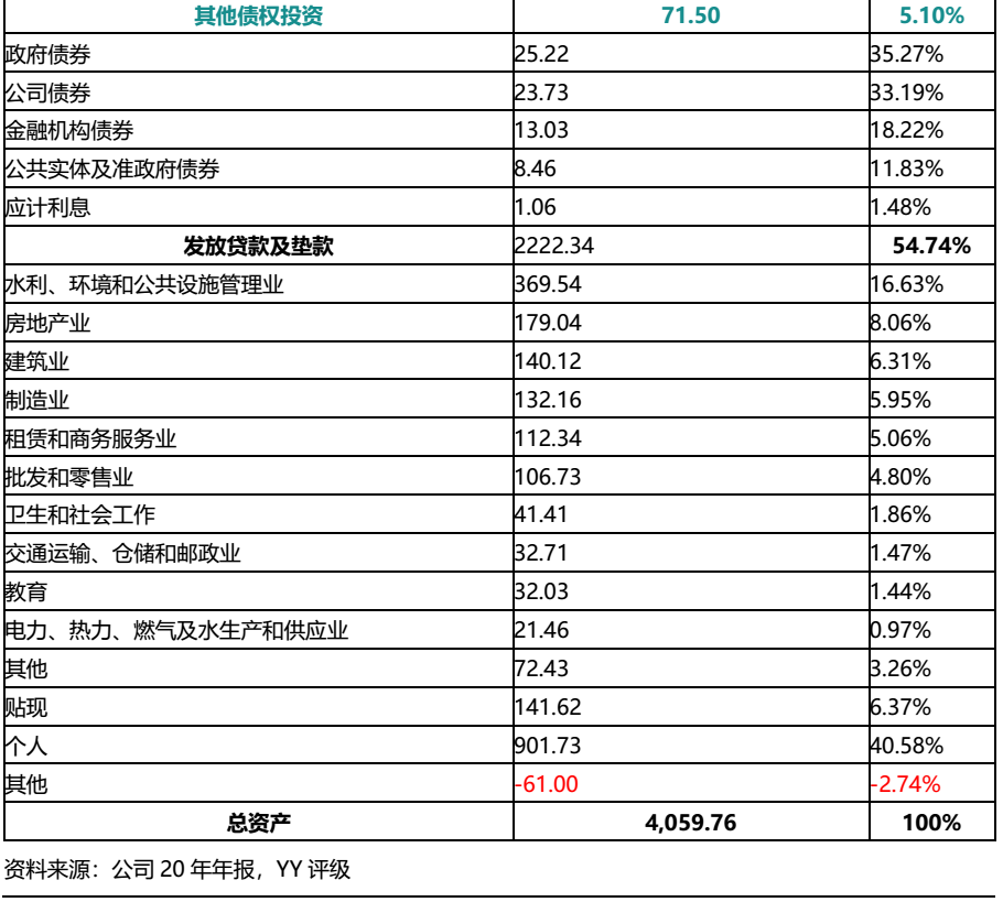 華融湘江銀行2020年資產(chǎn)總計4,059.76億元,主要由金融投資和發(fā)放貸款及墊款構(gòu)成,二者合計占比89.29%。其中金融投資主要為債權(quán)投資,從明細(xì)來看,華融湘江銀行金融投資主要投向債券類資產(chǎn);發(fā)放貸款及墊款則主要面向個人,水利、環(huán)境和公共設(shè)施管理業(yè),房地產(chǎn),建筑業(yè)和制造業(yè)等行業(yè)。