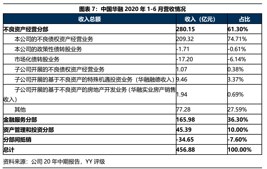 中國華融聚焦不良資產(chǎn)的收購、管理與處置,業(yè)務(wù)主要分為不良資產(chǎn)經(jīng)營、金融服務(wù)和資產(chǎn)管理與投資三大板塊。其中不良資產(chǎn)經(jīng)營業(yè)務(wù)包括不良債權(quán)資產(chǎn)經(jīng)營、政策性債轉(zhuǎn)股業(yè)務(wù)、市場化債轉(zhuǎn)股業(yè)務(wù)以及子公司開展的不良債權(quán)資產(chǎn)經(jīng)營業(yè)務(wù)、基于不良資產(chǎn)的特殊機(jī)遇投資業(yè)務(wù)、基于不良資產(chǎn)的房地產(chǎn)開發(fā)業(yè)務(wù);公司金融服務(wù)和資產(chǎn)管理與投資業(yè)務(wù)則主要由子公司負(fù)責(zé)經(jīng)營。
