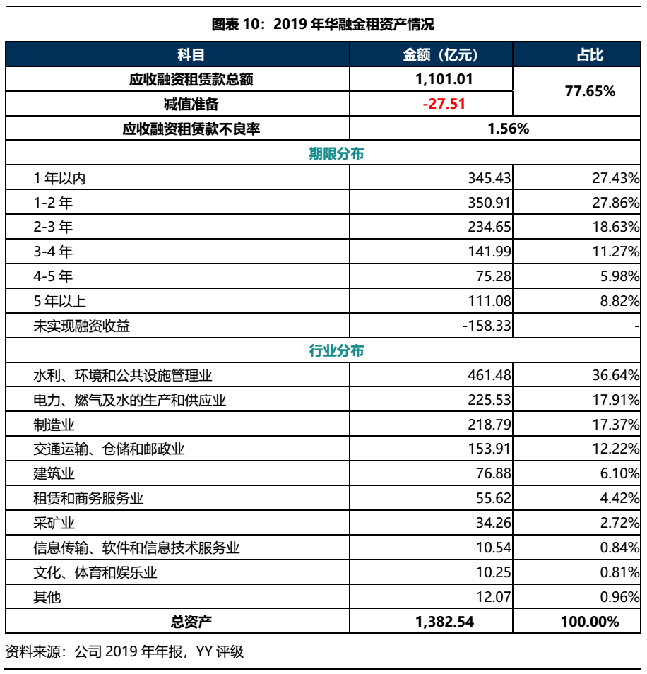 華融金租2019年資產(chǎn)總計1,382.54億元,主要為應(yīng)收融資租賃款,其中應(yīng)收融資租賃款不良率1.56%,較上年上升0.07%。從期限來看,公司應(yīng)收融資租賃款以3年內(nèi)為主,其中1年內(nèi)應(yīng)收融資租賃款占比27.43%,3年以上占比26.07%;行業(yè)來看主要集中在水利、環(huán)境和公共設(shè)施管理業(yè),電力、燃?xì)饧八纳a(chǎn)和供應(yīng)業(yè),制造業(yè)和交通運(yùn)輸、倉儲和郵政業(yè)等。