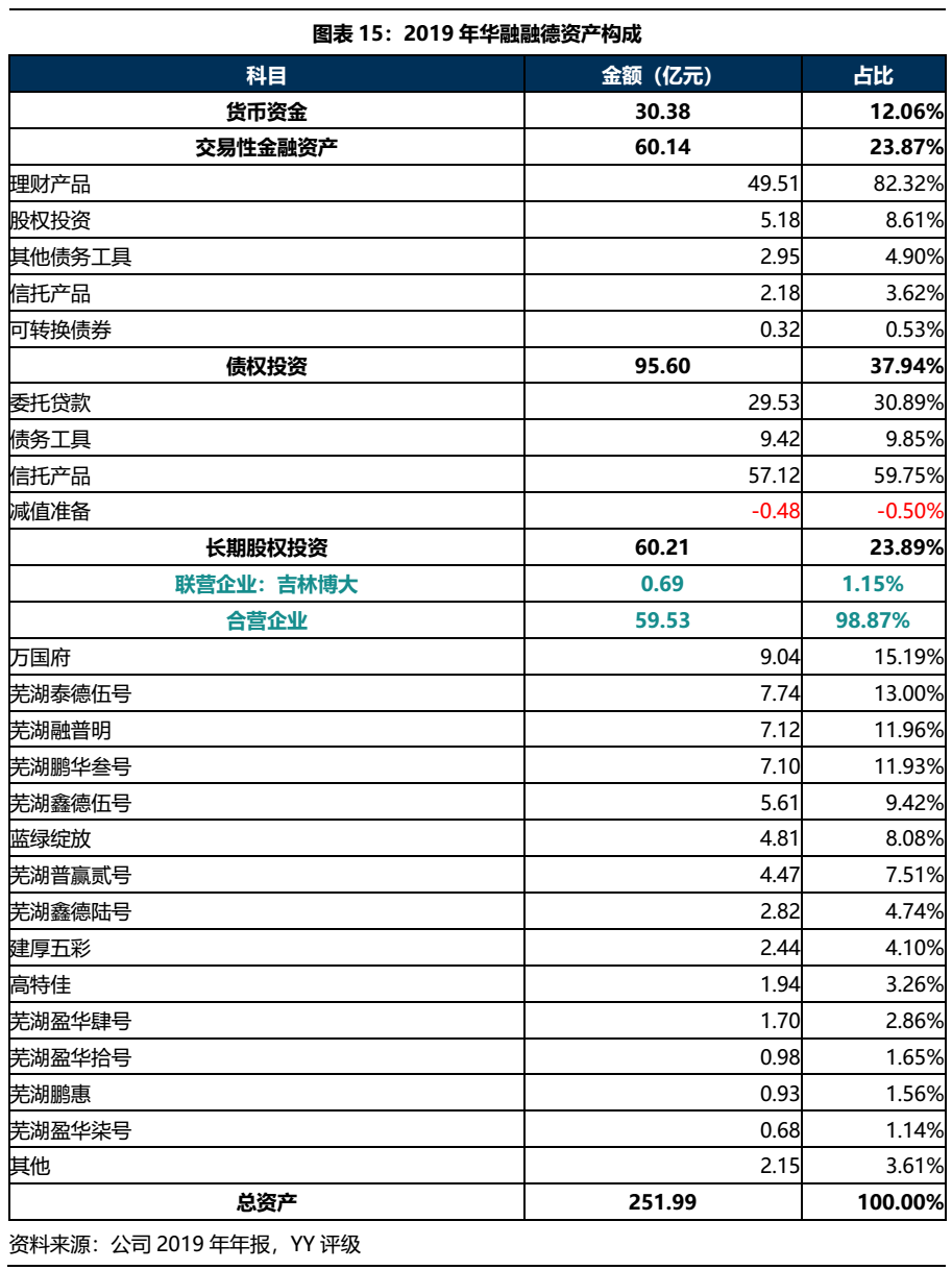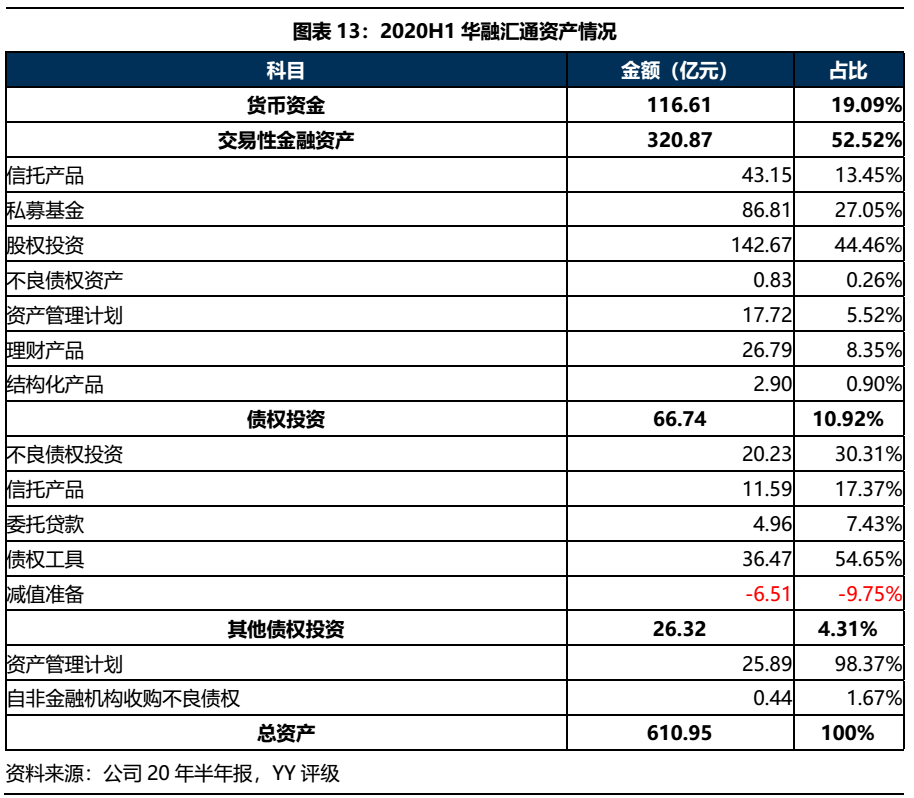 由于不再并表華融晉商,華融匯通資產(chǎn)規(guī)模2019年以來大幅下降,2020年6月末,公司總資產(chǎn)610.95億元,相較2018年總資產(chǎn)規(guī)模(1155.45億)近乎腰斬。從資產(chǎn)構(gòu)成來看,華融匯通資產(chǎn)以貨幣資金、交易性金融資產(chǎn)和債權(quán)投資為主,交易性金融資產(chǎn)主要投向股權(quán)、私募基金和信托產(chǎn)品;債權(quán)投資則以債權(quán)工具、不良債權(quán)投資及其他權(quán)益投資的資產(chǎn)管理計劃為主,整體以投資類資產(chǎn)為主,需關(guān)注投資風(fēng)險。
