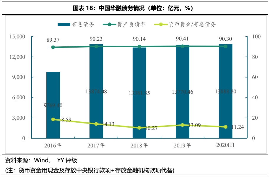 從負(fù)債率來看,華融系各公司負(fù)債率均超過了75%,華融實業(yè)財務(wù)杠桿更是高達(dá)95.67%,整體融資空間有限。從有息債務(wù)來看,中國華融有息債務(wù)規(guī)模高達(dá)13,888.80億元,占總資產(chǎn)的80.21%,貨幣資金/有息債務(wù)為11.24%,覆蓋程度較低。
