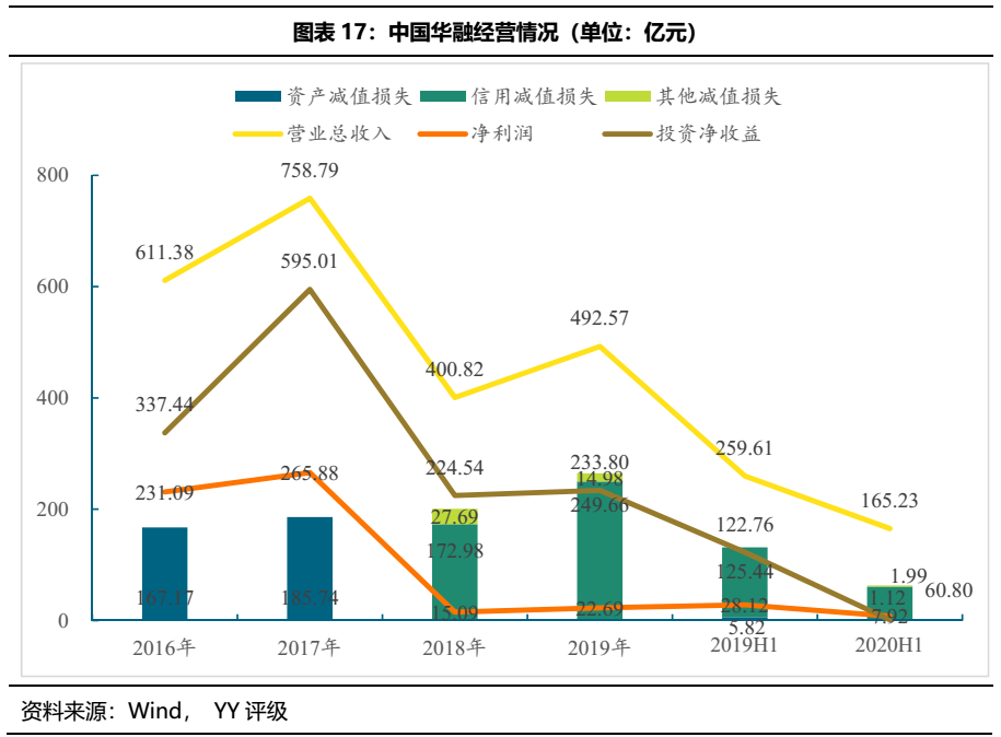從經(jīng)營來看,中國華融2018年營收大幅下降47.18%,凈利潤更是從265.88億元大幅縮水至15.09億元。2019年經(jīng)營業(yè)績有所好轉(zhuǎn),但相較于17年前大幾百的凈利潤仍是相距甚遠(yuǎn)。16年以來中國華融各類減值損失呈增長趨勢,2019年合計264.64億元,對利潤侵蝕嚴(yán)重。