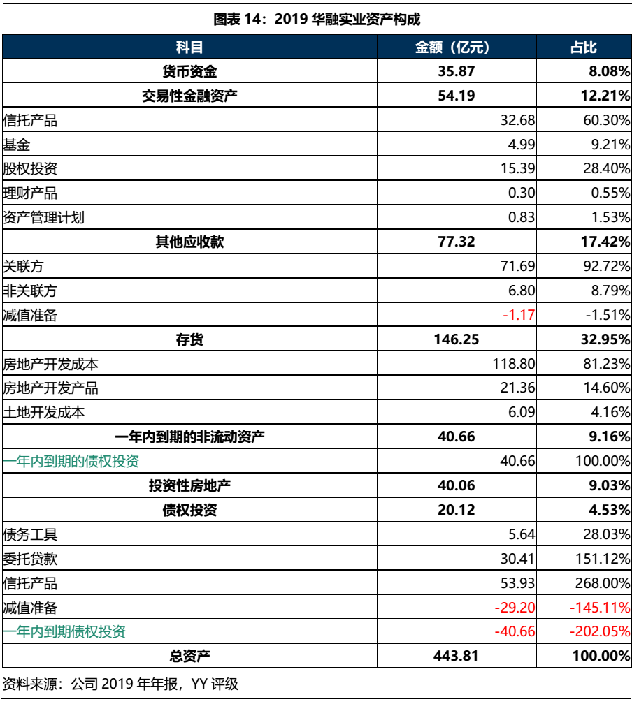 華融實業(yè)2019年資產(chǎn)合計443.81億元,主要為存貨、其他應(yīng)收款、交易性金融資產(chǎn)、一年內(nèi)到期的非流動資產(chǎn)、貨幣資金、投資性房地產(chǎn)和債權(quán)投資,由于不再并表華融國際,資產(chǎn)規(guī)模相較于2018年的2,569.68億元大幅下降。