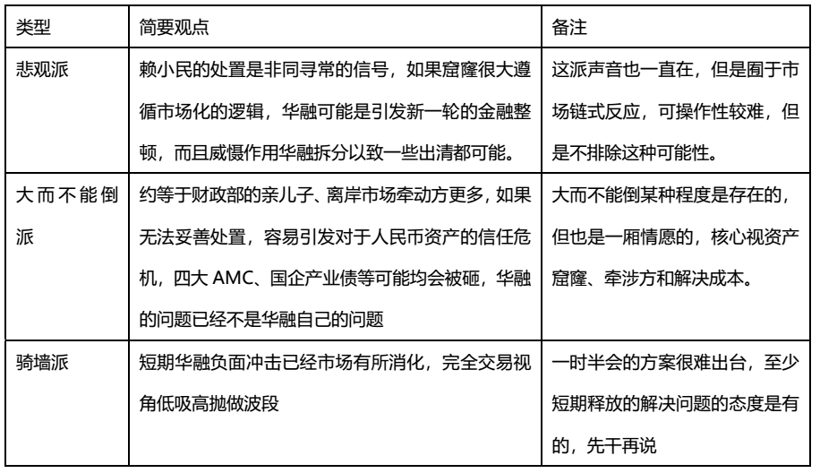 現(xiàn)在到了算大賬,清點(diǎn)代價的時候,華融到底是整體資產(chǎn)包打包處置,還是拆著賣,債到底隨資產(chǎn)走,還是先把網(wǎng)狀的債務(wù)割開成為一個個線性的各個擊破、甚至還有投資者在默默祈禱能不能先把資本市場的兌付了剩下該干啥干啥。