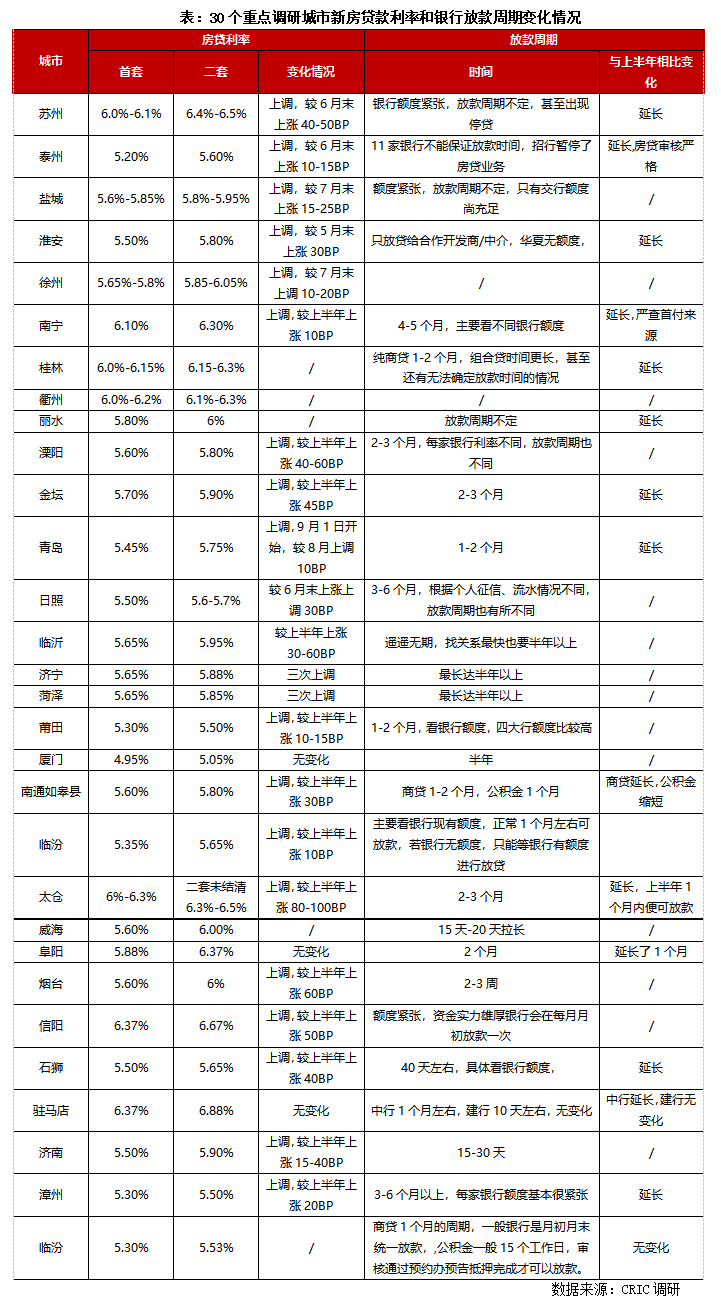 總體來看,四大行額度相對充裕,放款時間也略快于其他商業銀行,不過半數以上城市放款周期較上半年均有了不同程度的延長,房貸整體審核也更加嚴格,諸如南寧、泰州、麗水等地均需嚴格審核客戶資質,包括首付資金來源,個人還款能力等多項內容。