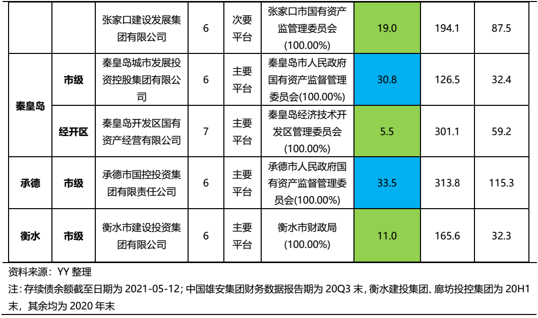 第三梯隊的邢臺、秦皇島、張家口、衡水和承德市域經濟偏弱,各有1-2家存續債平臺,業務及資源較為集中,YY評級均在6附近。除承德、衡水(相關信息缺失)外,其余三市融資結構均有隱憂,邢臺、張家口非標融資占比偏高,分別約為19.4%、26.1%;秦皇島平臺融資則過于依賴債券(約83%),公開市場債務續作壓力很大。