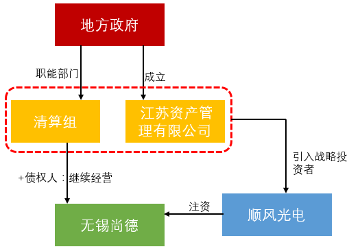 由地方政府職能部門組成的清算管理人在對無錫尚德進行調(diào)研的基礎(chǔ)上,與債權(quán)人達成一致讓企業(yè)得以繼續(xù)經(jīng)營。江蘇省人民政府同意由無錫市國聯(lián)發(fā)展(集團)有限公司作為主發(fā)起人設(shè)立江蘇省資產(chǎn)管理有限公司。