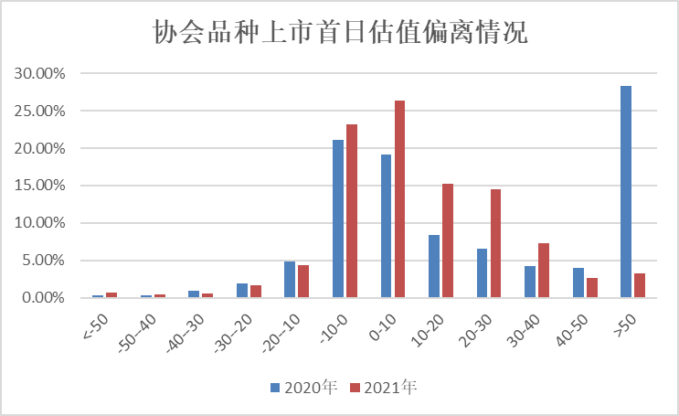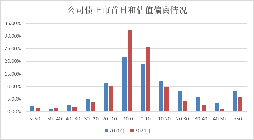 還是用數據說話,先來看看協會產品的上市首日估值和票面利率之差,2021年和2020年的對比情況。可以看到估值偏離在±10bp的市場化發行占比有了明顯提高,而偏離50bp這種極端行為(主要集中在scp上),占比從2020年的超過25%,下降到2021年的不足5%。