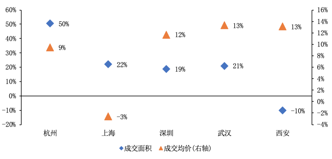 具體表現為核心城市熱點區域地價拉動房價超漲,房價同比增速大于地價。深圳南山區、杭州富陽區、西安西咸新區、武漢武昌區、硚口區和漢陽區房價同比漲幅超過地價,其中武昌區和西咸新區房價同比超地價13pcts達20%。從市場表現來看,上述幾區也是樓市升溫最快的區域,新房成交體量最大、去化最高。