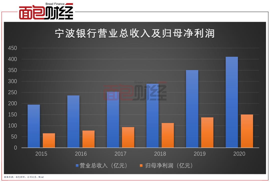 2020年,寧波銀行實(shí)現(xiàn)營(yíng)業(yè)收入411.11億元,同比增加60.29億元,增幅為17.19%;實(shí)現(xiàn)歸母凈利潤(rùn)150.50億元,同比增加13.36億元,增幅為9.73%。