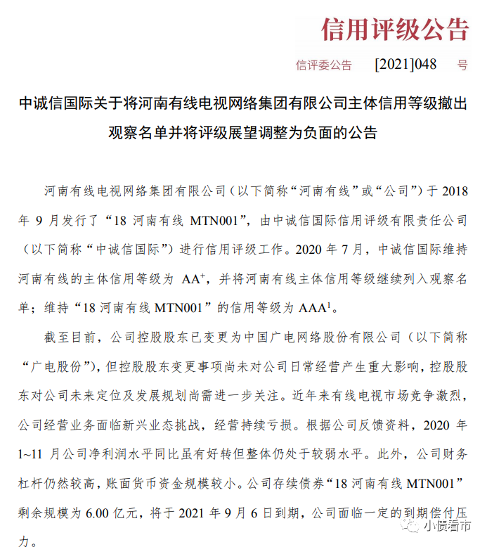 1月19日,中誠信國際公告稱,決定維持河南有線電視網(wǎng)絡(luò)集團(tuán)有限公司(以下簡稱“河南有線”)的主體信用等級為AA+,將上述主體信用等級撤出觀察名單,并將評級展望調(diào)整為負(fù)面;維持“18河南有線MTN001”的信用等級為AAA。