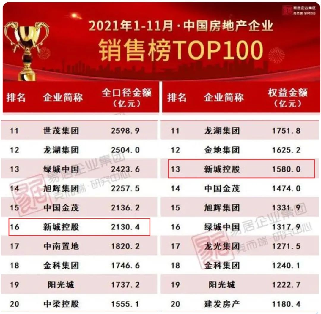 根據最新發布的克而瑞“2021年1-11月中國房地產企業銷售榜TOP100”名單,杠桿地產看到新城控股的全口徑銷售額排名16,權益銷售額以1580億元排名13。權益占比大概在74%。