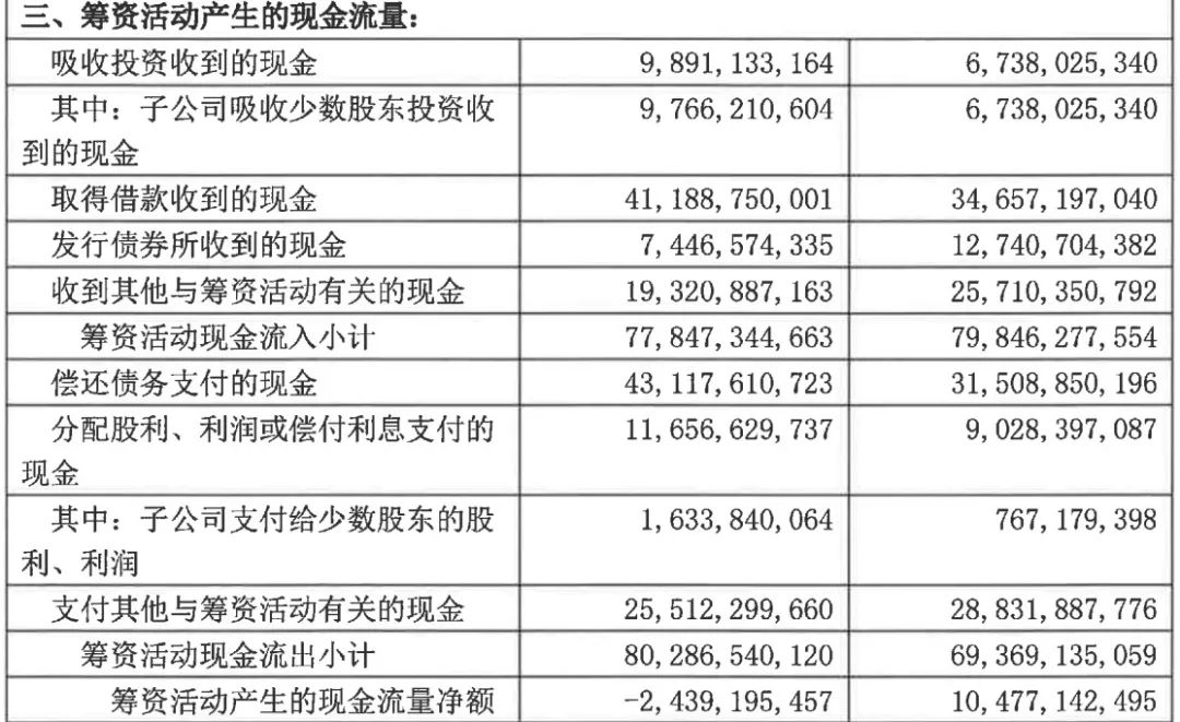 其中籌資流入的現金同比減少了,主要減少在發行債券這一項;但償還債務同比增加了100多億,直接導致籌資活動的現金流量凈額為負。
