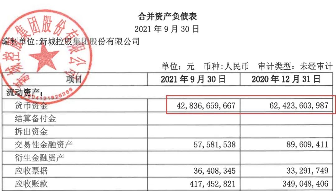 另外值得注意的是快速下降的貨幣資金。三季報數據里,新城控股截至2021年9月30日的貨幣資金為428.37億元,比去年底的624.24億元減少近196億元。