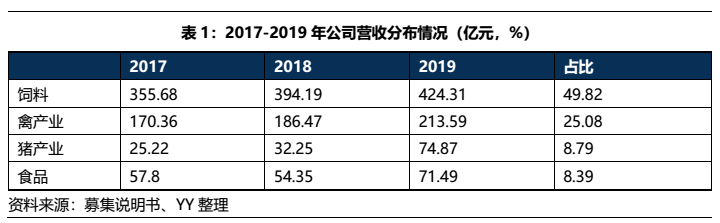 公司以飼料起家,不斷加大養殖與食品端的布局,走多元化與養殖食品一體化的轉型之路。目前公司已經覆蓋了飼料-養殖-屠宰-食品全產業鏈,其中飼料為核心業務,占營收的50%左右,禽養殖、生豬養殖和食品業務均已初具規模,分別占營收的25%、8.8%、8.4%。