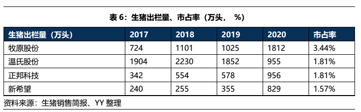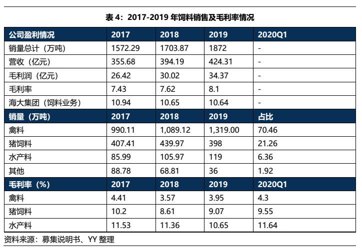 公司是國內最大的飼料供應商,市占率在7.5%,與第二第三(市占率為4.7%、4.4%)已經拉開一定的差距,規模優勢明顯,在19年全國工業飼料產量同比-3.7%的背景下,公司的飼料銷量仍舊實現了9.9%的增幅,銷量增長較為穩定,收入和毛利也隨銷量穩定增長。