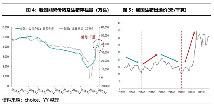 從價格來看, 21年豬肉價格仍有一定支撐。21年初非洲豬瘟疫情多點散發,導致母豬淘汰加劇、存欄量折損,短期生豬產能恢復受阻,加上春節前后集中拋售,短期內生豬存欄下降,供給偏緊,而節后補欄情緒高漲,仔豬價格連續上漲,飼養成本增加,均為21年豬肉價格提供了一定支撐。