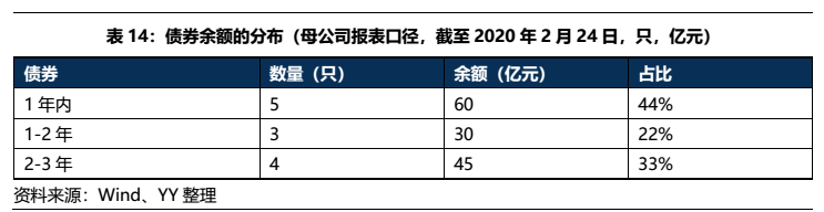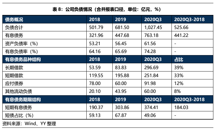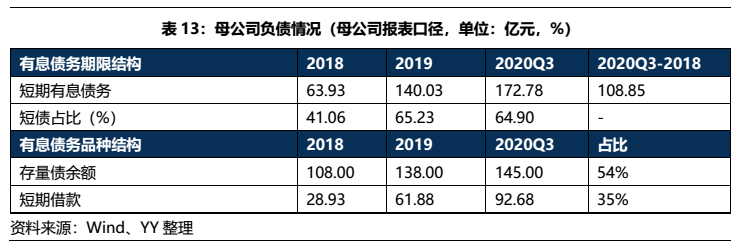 從債務期限結構上看,短債占比偏高(65%),短期償債壓力偏大;從品種結構來看,以債券和短期借款為主,截至2020Q3末母公司的存量債規模為145億,占據有息債務的54%左右,規模較大,資本市場依賴度上升。