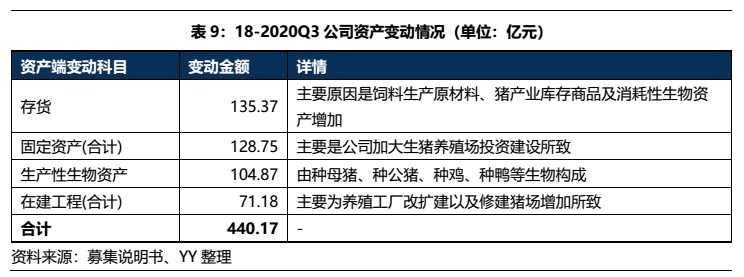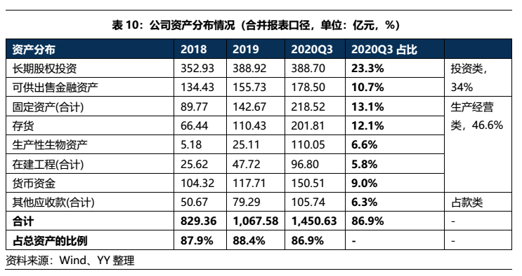 總體而言,公司的資產形成來看經營驅動邏輯清晰。截至20年9月末,公司資產主要為生產經營類資產(46.6%)、投資類資產(34%)和其他應收款(6.3%)。生產經營類資產主要是養殖場等,具有較強的盈利屬性;長期股權投資共389億,其中有192億為民生銀行、85億為新希望地產、20億為華創陽安,質量均較好;所以總體而言公司的資產較硬。