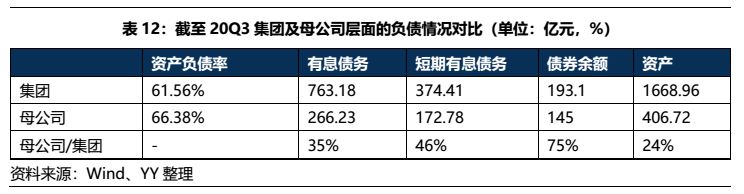 從母公司來看,債務負擔比集團更加沉重。母公司沒有實質業務,主要依靠投資收益,截至20Q3末母公司資產僅占集團的24%左右,卻承擔了35%的有息債務,75%的債券償付壓力都集中在母公司,母公司資產負債率已經到66.38%,有息債務達266億,債務負擔較重。