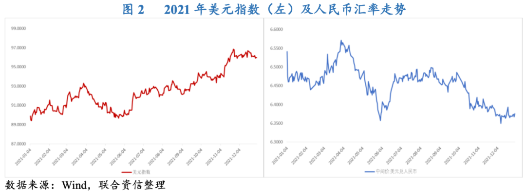 2021年,美元指數在美國經濟轉好后市場風險情緒升溫、市場對美聯儲收緊貨幣政策以及加息的預期落實時間不斷提前、美元避險功能在疫情反復期間不斷凸顯以及歐元區國家經濟復蘇進度普遍落后于美國等因素的推動項下波動上行,繼11月突破96點以后美元指數在12月31日收于95.9701,較年初跳漲6.78%。