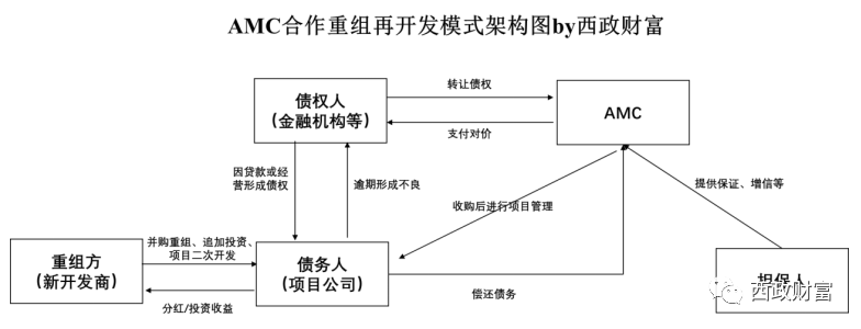 1. 在AMC合作重組再開發(fā)模式下,由新開發(fā)商作為重組方支付股權(quán)轉(zhuǎn)讓對(duì)價(jià),AMC承接項(xiàng)目公司的金融債務(wù);