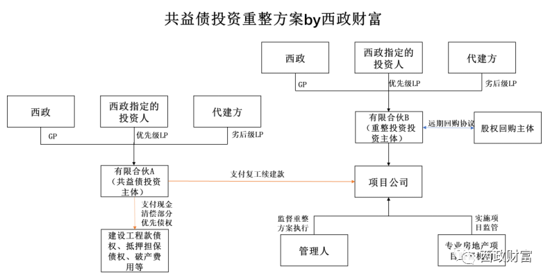 對(duì)于涉及到不良資產(chǎn)的項(xiàng)目,當(dāng)下不少開發(fā)商試圖介入其代建的相關(guān)業(yè)務(wù),同時(shí)要求其只負(fù)責(zé)代建,而不愿意出資。對(duì)于此類項(xiàng)目,出于風(fēng)控要求,我們通常會(huì)要求與代建方針對(duì)共益?zhèn)鶛?quán)投資部分與股權(quán)調(diào)整部分分別設(shè)立不同的主體(共益?zhèn)顿Y主體以及重整投資主體)對(duì)項(xiàng)目公司進(jìn)行投資,主要的盤活資金由共益?zhèn)鶛?quán)投資部分支付,用于收購前期的抵押債權(quán)、支付欠付的工程款等;由于項(xiàng)目公司已資不抵債,股權(quán)價(jià)值為0,股權(quán)調(diào)整時(shí)通常由新設(shè)重整投資主體以較低的價(jià)格投入,并100%持股項(xiàng)目公司,并進(jìn)行風(fēng)控措施安排。其中,代建方作為劣后級(jí),出資比例在20%左右。