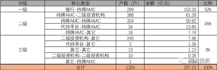 我們按行業(yè)慣性,把銀行出包定為一級(jí)市場(chǎng);AMC收包、出包定為二級(jí)市場(chǎng);其它為三級(jí)市場(chǎng),同時(shí)為方便統(tǒng)計(jì)把其它-持牌AMC這種小批量的行為定為三級(jí)市場(chǎng)。